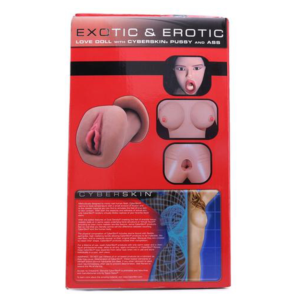 Exotic & Erotic Inflatable Love Doll with CyberSkin Pussy & Ass, life-size inflatable Love Doll. The Virtual Touch CyberSkin pussy,?ass and ribbed love tunnel feel amazingly realistic. Realistic, 3D face with soft, luscious lips and a sensual, “deep throat” mouth, extra long dark, sleek hair, perky breasts with realistic erect nipples.
